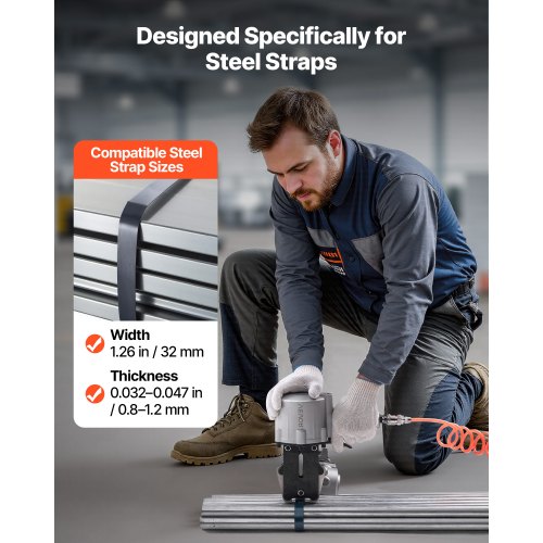 VEVOR Pneumatic Steel Strapping Machine for 1.26 in Metal Straps Banding Tool<br/>High-strength Aluminum Alloy Body<br/>Reinforced Buckle Groove<br/>C-Type Quick Connector<br/>Easy to Operate<br/>High-frequency Use<br/>Wide Applications<br/>Applicable Strapping Type: Steel Strap,Applicable Strap Size:,Product Dimensions:,Tensioner: 9 lbs / 4.1 kg,Thickness: 0.0315-0.0472 in / 0.8-1.2 mm,Air Inlet Type: Type C Quick Connector,Type: Split-Type Pneumatic Strapping Tool Set (A: Tensioner; B: Sealer),Working Air Pressure Range: 0.6-0.8 Mpa,Sealer: 6.8 lbs / 3.1 kg,Item Model Number: CL-GSCDYA32,Product Weight:,Width: 1.26 in / 32 mm,Tension Force: 8500 N