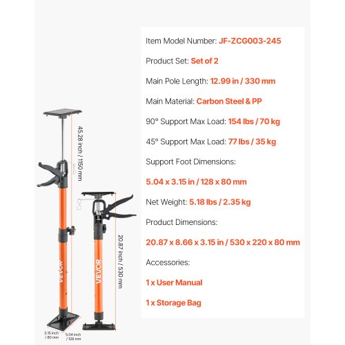 VEVOR 2Pcs Cabinet Jack Support Pole 21.3-60 in Telescopic Quick Support Rod<br/>Versatile Support<br/>Flexible Angle Adjustment<br/>Easy Operation<br/>Portable & Convenient<br/>Wide Applications<br/>Simple Setup<br/>Support Foot Dimensions: 5.04 x 3.15 in / 128 x 80 mm,Item Model Number: JF-ZCG003-245,Product Set: Set of 2,Main Pole Length: 12.99 in / 330 mm,Product Dimensions: 20.87 x 8.66 x 3.15 in / 530 x 220 x 80 mm,Net Weight: 5.18 lbs / 2.35 kg,Main Material: Carbon Steel & PP