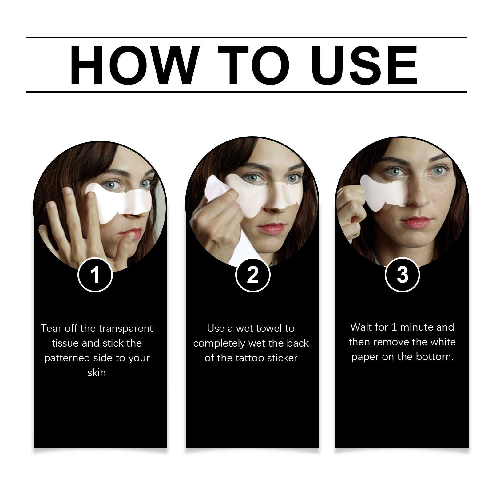 Our Makeup Patches contain Water Transfer Tattoo Stickers, PE Film. It can enhance facial beauty, make your makeup more confident, attract attention wherever you go, and leave a lasting impression. Its use method is very simple: tear off the transparent paper, paste the patterned side on the skin, wet the back of the tattoo with a wet towel, wait 1 minute and remove the white paper on the bottom. It can lead fashion trends and keep up with new beauty trends, suitable for everyday makeup, parties or photography.