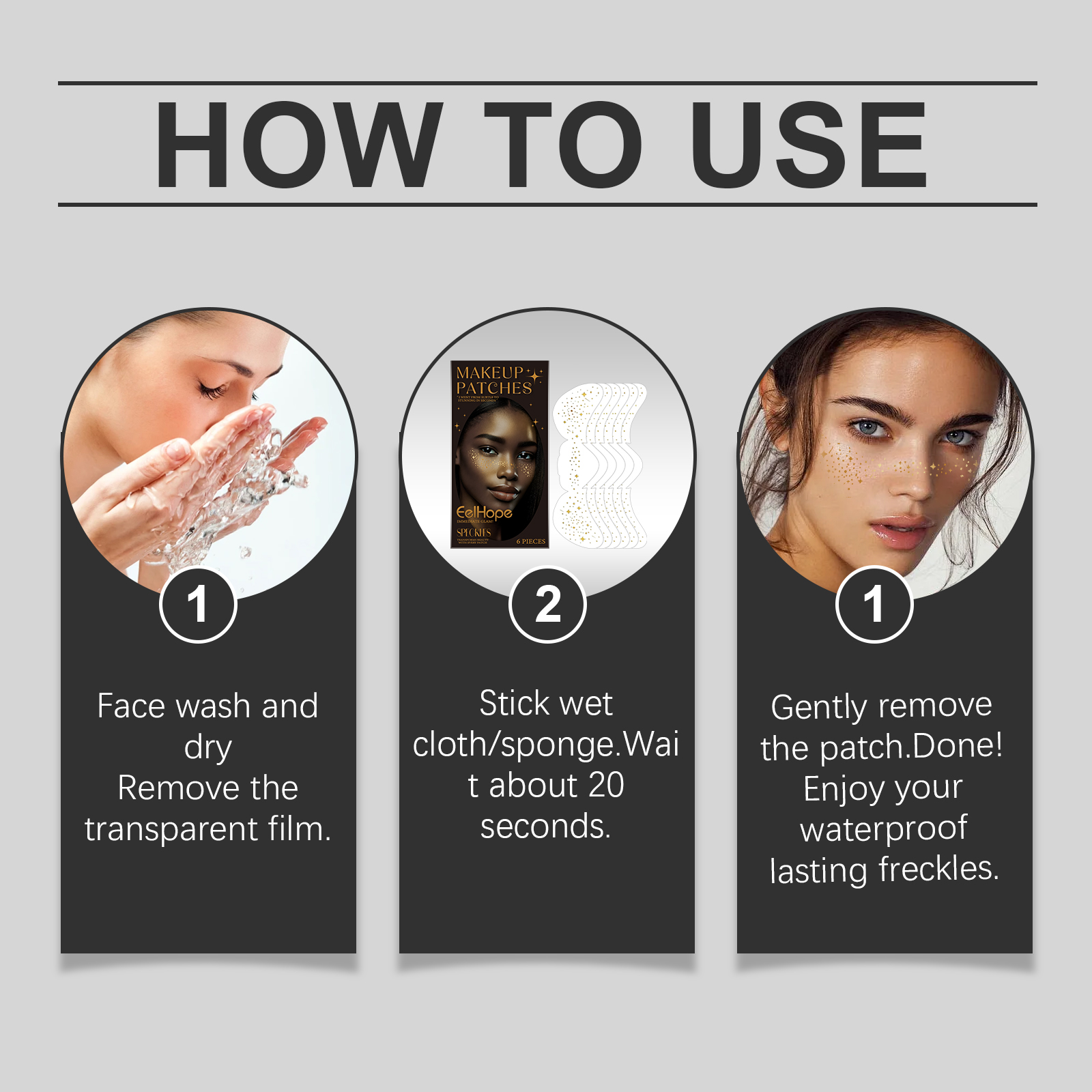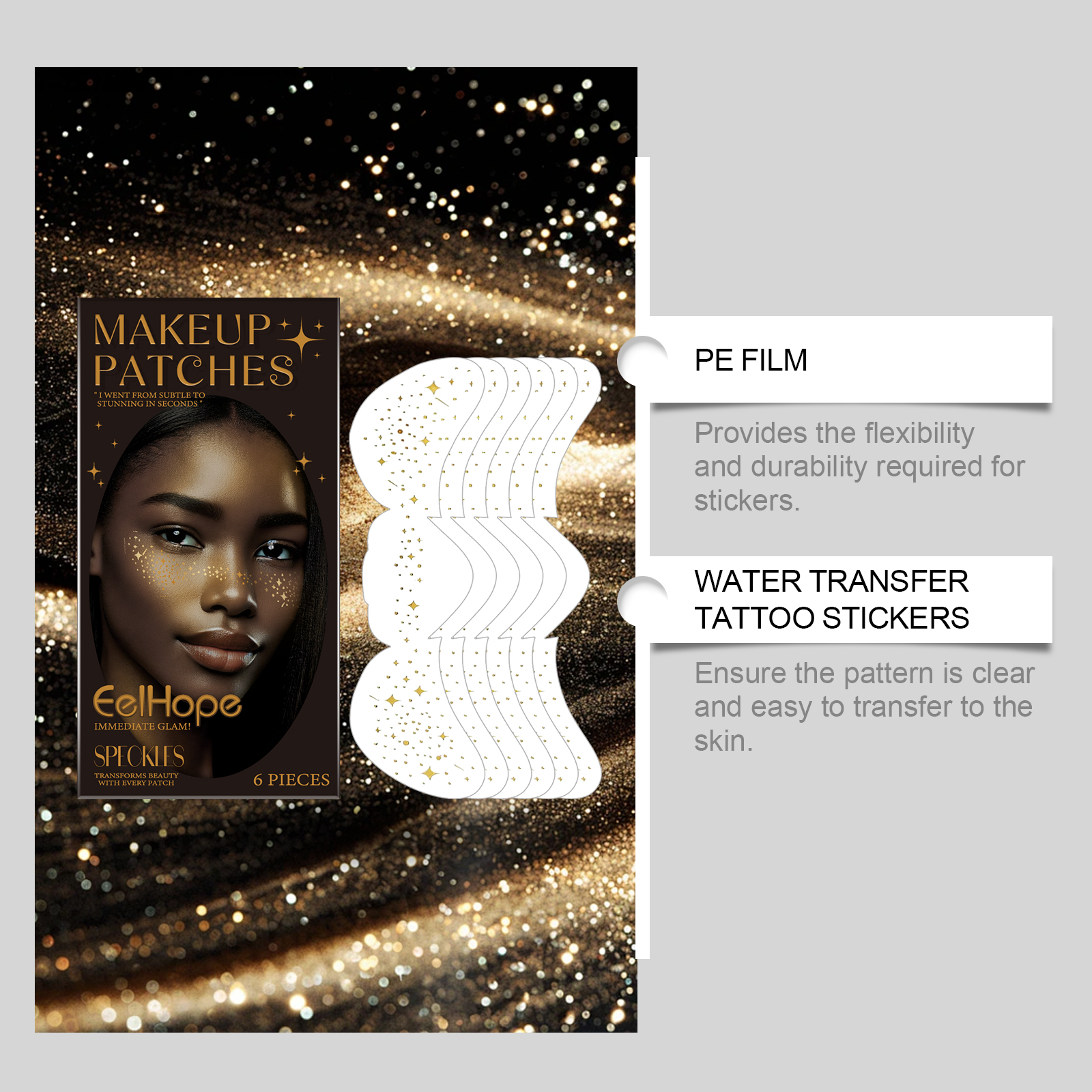 Our party freckle Tattoo stickers contain water transfer tattoo stickers and PE film. It can provide the flexibility and durability required for stickers. Make sure the pattern is clear and easy to transfer to the skin. Its use method is very simple: 1. Wipe dry after cleansing, remove the transparent film. 2. Apply damp cloth/sponge. Wait about 20 seconds. 3. Gently remove the patch. Done! Enjoy your waterproof, long-lasting freckles. Embellish to your liking to create a unique look.