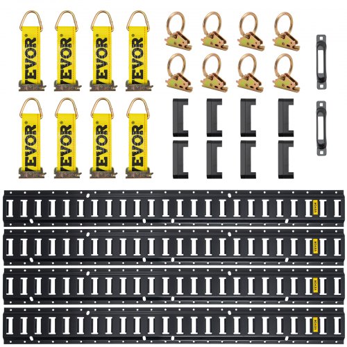 VEVOR E Track Tie-Down Rail Kit, 30PCS 5FT E-Tracks Set Includes 4 Steel Rails & 2 Single Slot & 8 O Rings & 8 Tie-Offs w/D-Ring & 8 End Caps, Securing Accessories for Cargo, Motorcycles, and BikesVersatile E Track Tie-Down System4 Versatile Sturdy E-Track Rails8 Durable Straps with D-Ring8 Functional Steel O-Rings8 Protective End CapsSimple Installation & UseTie-off Size: 2 x 6 in / 5 x 15 cm,Slot Interval: 1 in / 25 mm,O-ring Diameter: 2.5 in / 64 mm,Color: Black,Material: Steel,Rail Length: 5 ft / 1.52 m,Tie-off Max Capacity: 1000 lbs / 454 kg,Model: VV-ETS-TD530,Slot Length: 2.5 in / 64 mm,Rail Thickness: 2 mm,Number of Items: 30,Finish: Black Coated,Net Weight: 33.29 lbs / 15.1 kg,Slot Width: 1 in / 25 mm,O-ring Max Capacity: 1500 lbs / 680 kg,Rail Width: 5.2 in / 132 mm