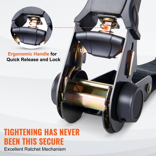 VEVOR Ratchet Tie Down Straps (4PK), 2200 lb Max Break Strength, Includes 4 Premium 1" x 15' Rachet Tie Downs with Padded Handles, for Moving Securing Cargo, Appliances, Lawn Equipment, MotorcycleHeavy-Duty HooksCoated RatchetAbundant AccessoriesVersatile ApplicationsRated Load Strength: 733 lbs / 332.5 kg,Item Model: XMRS25-4,Item Thickness: 0.04 inch/ 0.93 mm,Hook Material: Carbon Steel,Net Weight (including all accessories): 5.7 lbs / 2.57 kg,Breaking Strength: 2200 lbs / 998 kg,Surface Treatment: Black Spray Coating,Hook Thickness (Diameter): 0.38 inch / Φ9.6 mm,Item Dimensions: 1 inch x 15 ft / 0.025 m x 4.6 m,Quantities: 4 Pieces,Item Width: 1 inch / 25.4 mm,Webbing Material: Polyester