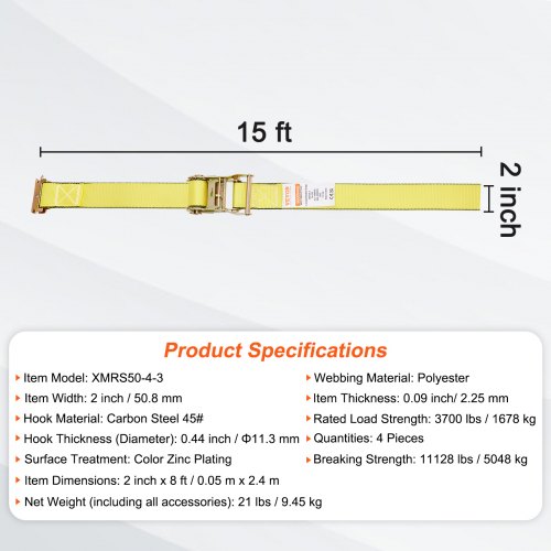 VEVOR Ratchet Tie Down Straps (8PK), 4400 lb Break Strength, E-Track Endless Ratchet with 8 Premium 2" x 15' Rachet Tie Downs Heavy Duty, for Moving Securing Cargo, Appliances, Lawn EquipmentHeavy-Duty HooksCoated RatchetAbundant AccessoriesVersatile ApplicationsRated Load Strength: 1460 lbs / 662.2 kg,Item Model: XMES50-8,Item Thickness: 0.05 inch/ 1.2 mm,Hook Material: Carbon Steel 40Mn,Net Weight (including all accessories): 15.4 lbs / 7 kg,Hook Thickness: 0.1 inch / 2.5 mm,Breaking Strength: 4400 lbs / 1995.8 kg,Surface Treatment: Color Zinc Plating,Item Dimensions: 2 inch x 15 ft / 0.05 m x 4.6 m,Quantities: 8 Pieces,Item Width: 2 inch / 50.8 mm,Webbing Material: Polyester
