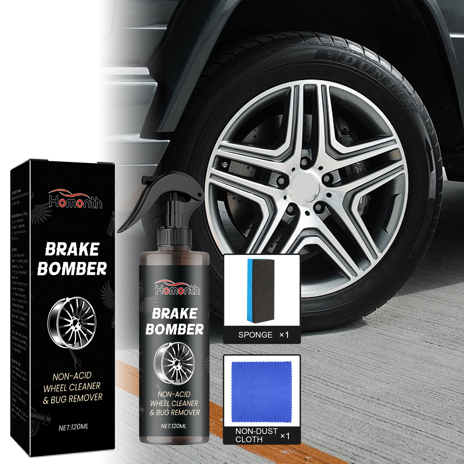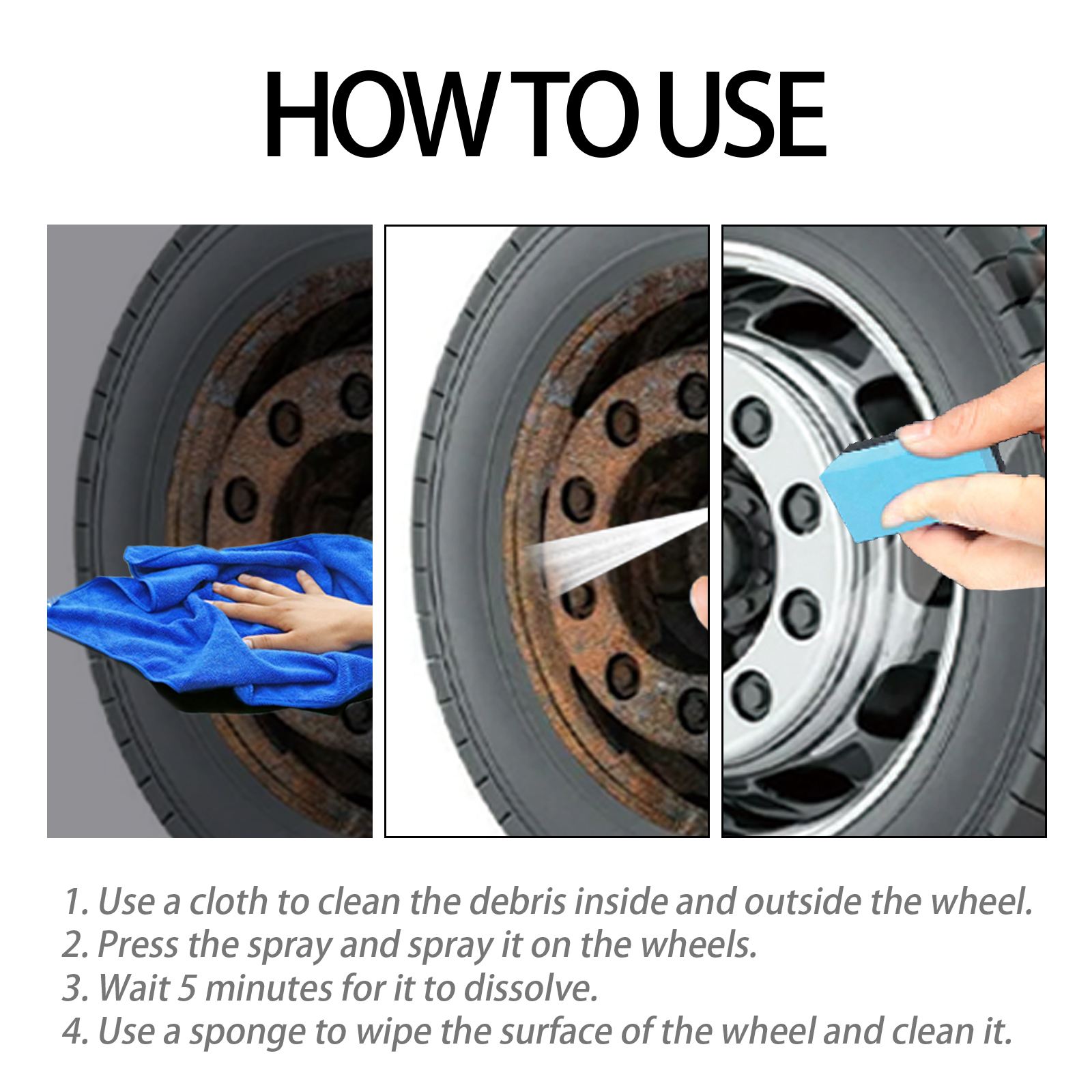 Our wheel cleaner contains baking soda, lemon extract, and sodium percarbonate. It can help you deal with stubborn wheel dust, road dirt and bug marks and make your wheels look brand new. A mild formulation that can be used on most types of wheel finishes, including alloy, chrome, paint and clear coated wheels. Its use method is very simple: 1. Wipe the debris inside and outside the wheel with cloth; 2. Press the sprayer and spray onto the wheel. 3. Wait 5 minutes for it to dissolve. 4. Wipe the surface of the wheel with a sponge and clean it. Easy to use, just spray and scrub directly, saving cleaning time.