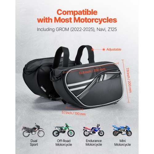 VEVOR Motorcycle Saddlebag Waterproof Motorcycle Side Bag Travel Luggage 30 L<br/>Universal Motorcycle Side Bag<br/>Flexible Storage<br/>Stable Mounting<br/>Built for Long-Term Use<br/>Rider-Friendly Design<br/>Installation Tip<br/>Main Materials: 600D Oxford Fabric + PVC Coating + Pearl Cotton,Capacity: 15 L per Side, 30 L Total,Item Model Number: NMXQ007,Product Weight: 2.2 lbs/1.0 kg,Expanded Dimensions: 13.8 x 7.9 x 6.7 in/350 x 200 x 170 mm,Product Dimensions: 13.8 x 7.9 x 5.1 in/350 x 200 x 130 mm