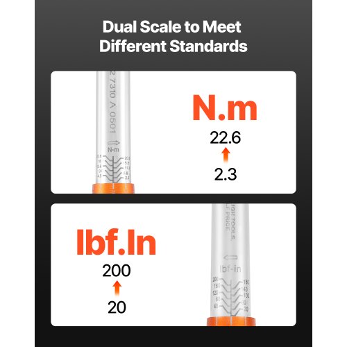 Click Torque Wrench Set 1/4 Inch Drive 20-200lbf-in /2.3-22.6N.m 72-Tooth Orange±3% High PrecisionSuitable for Various Work EnvironmentsPrecise ReadingsAutomatic NotificationPortable Tool Case72-Tooth RatchetAccuracy: ±3% (clockwise),Torque Increment: 20 lbf-in / 2.2 N.m,Teeth Count: 72,Display Units: In-Lb / N.m (two units),Item Model Number: SG16002A,Product Style: Scale Type,Wrench Dimensions: 9.25 x 1.16 x 1.16 in / 235 x 29.5 x 29.5 mm,Net Weight (with all accessories): 1.77 lb / 0.804 kg,Drive Head Size: 1/4",Torque Range: 20–200 lbf-in / 2.3–22.6 N.m (Pipe Length: 148mm),Box Dimensions (L x W x H): 10.63 x 3.29 x 2.26 in / 270 x 83.6 x 57.3 mm