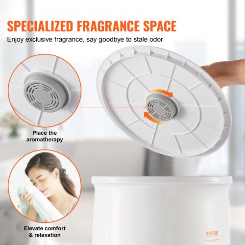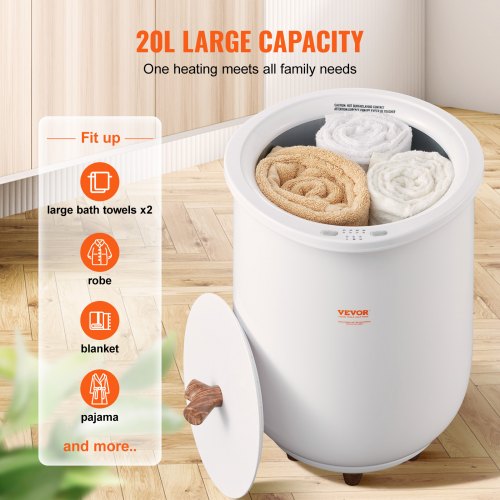 VEVOR Towel Warmer Bucket, 20L Large Towel Warmer for Bathroom, Auto Shut Off Towel Heater with 4-Level Timer Fits up to Two 40"x70" Oversized Towels, Bathrobes, Blankets, ETL & FCC CertifiedUser-Friendly OperationExtra-Large CapacityAromatherapy OasisWarmth and Safety in OnePortability Without InstallationAuto Shutdown for Added SafetyRated Voltage/Frequency: AC120V, 60HZ,Capacity: 20 L,Item Model Number: E1819Z-US,Product Weight: 7.07 lbs ± 3%/3.21 kg ± 3%,Display Mode: LED Indicator; Red Light: Internal Temp. > 50+/-10℃,Rated Power: 465 W,Product Dimensions: 12.99 x 12.95 x 21.25 inch/330 x 329 x 540 mm