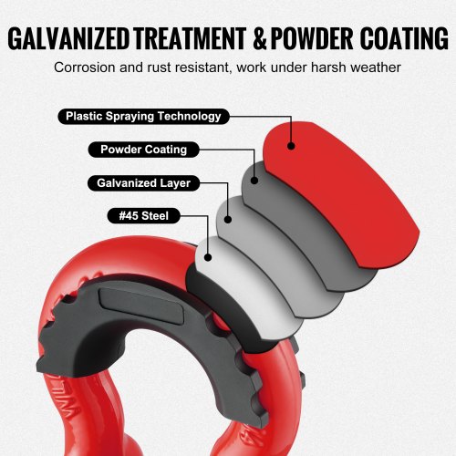 VEVOR 3/4" D-Ring Shackle, 2 Pack Alloy Steel Shackles 62832 lbs (28.5 Ton) Break Strength with 7/8" Screw Pin, Isolators & Washers, Heavy Duty Off Road Vehicle Recovery Shackle for Jeep Truck, RedD-Ring Alloy Steel ShackleHigh Load CapacityDetachable Screw PinTriple-Layer Surface TreatmentVersatile CompatibilityYour Ideal Towing CompanionWork Load Limit: 9500 lbs/4.75T,D-Ring Color: Red,Pin Color: Black,D-Ring Inner Diameter: 2.05 in/51 mm,Breaking Strength: 62831.74 lbs/28.5T,Item Model Number: G209-4.75T,D-Ring Material: #45 Steel,Product Weight: 5.51 lbs/2.1 kg,Pin Material: 40Cr Steel,Quantity: 2 PCS,Pin Diameter: 7/8 in/22 mm,D-Ring Wire Diameter: 0.75 in/19 mm
