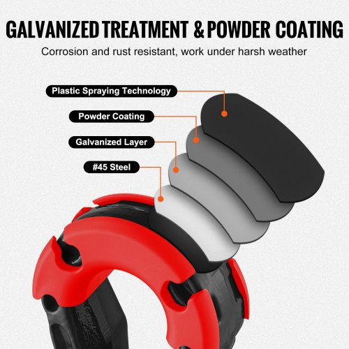 VEVOR 3/4" D-Ring Shackle, 2 Pack Alloy Steel Shackles 66139 lbs (30 Ton) Break Strength with 7/8" Screw Pin, Isolators & Washers, Heavy Duty Off Road Vehicle Recovery Shackle for Jeep Truck, BlackD-Ring Alloy Steel ShackleHigh Load CapacityDetachable Screw PinTriple-Layer Surface TreatmentVersatile CompatibilityYour Ideal Towing CompanionWork Load Limit: 17636.98 lbs/8T,D-Ring Color: Black,Pin Color: Red,D-Ring Inner Diameter: 2.08 in/52.8 mm,Breaking Strength: 66138.67 lbs/30T,Item Model Number: 8T,D-Ring Material: #45 Steel,Product Weight: 5.95 lbs/2.7 kg,Pin Material: 40Cr Steel,Quantity: 2 PCS,Pin Diameter: 7/8 in/22 mm,D-Ring Wire Diameter: 0.85 in/21.5 mm