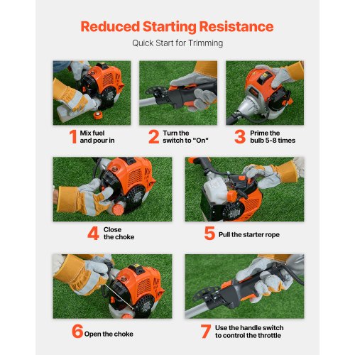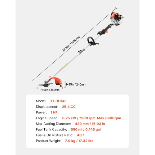 VEVOR String Trimmer, 25.2CC 2-Stroke, Gas Powered Weed Wacker, 16.9" Cordless Grass Trimmer, Multi-Functional Lawn Edger with Shoulder Strap & 3T Blade, Weed Eater for Quick Grass CleaningPowerful Cutting2-in-1 FunctionalityQuick StartStraight Shaft DesignUser-Friendly DesignAdjustable Main ShaftDimensions (L x W x H): 1850 x 380 x 240 mm / 72.83 x 14.96 x 9.45 in,Max Cutting Diameter: 430 mm / 16.93 in,Engine Speed: 0.75 kW / 7500 rpm; Max 8600 rpm,Fuel & Oil Mixture Ratio: 40:1,Item Model Number: TT-1E34F,Product Weight: 7.9 kg / 17.42 lbs,Fuel Tank Capacity: 550 ml / 0.145 gal,Displacement: 25.4 CC,Power: 1 HP