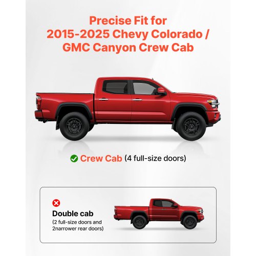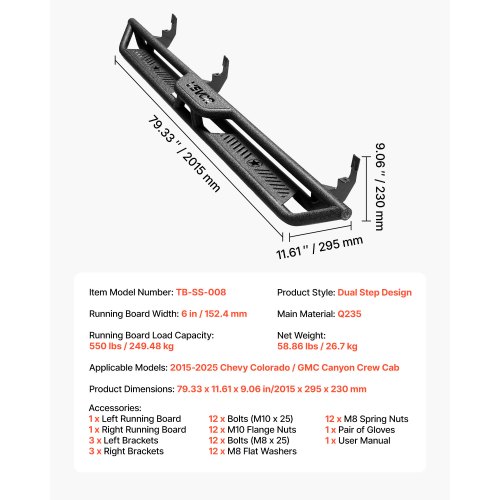 VEVOR Running Boards Nerf Bar Side Step 6 in for 15-25 Chevy Colorado Crew Cab<br/>Exact Fit<br/>One-Step Entry<br/>All-Weather Durability<br/>Practical Design<br/>Wide Application<br/>Side Body Protection<br/>Running Board Width: 6 in/152.4 mm,Running Board Load Capacity: 550 lbs/249.48 kg,Item Model Number: TB-SS-008,Product Style: Dual Step Design,Product Dimensions: 79.33 x 11.61 x 9.06 in/2015 x 295 x 230 mm,Net Weight: 58.86 lbs/26.7 kg,Main Material: Q235