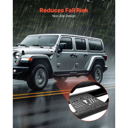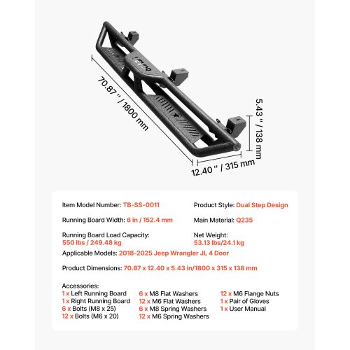 VEVOR Running Boards Nerf Bar Side Step 6 in for 18-25 Jeep Wrangler JL 4 Door<br/>Exact Fit<br/>One-Step Entry<br/>All-Weather Durability<br/>Practical Design<br/>Wide Application<br/>Side Body Protection<br/>Running Board Width: 6 in/152.4 mm,Running Board Load Capacity: 550 lbs/249.48 kg,Item Model Number: TB-SS-011,Product Style: Dual Step Design,Product Dimensions: 70.87 x 12.40 x 5.43 in/1800 x 315 x 138 mm,Net Weight: 53.13 lbs/24.1 kg,Main Material: Q235