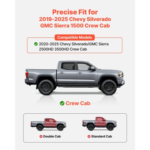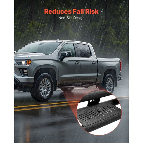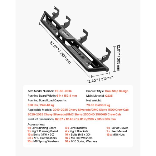 VEVOR Running Boards Nerf Bar Side Step 6 in for 19-25 Chevy Silverado Crew Cab<br/>Exact Fit<br/>One-Step Entry<br/>All-Weather Durability<br/>Practical Design<br/>Wide Application<br/>Side Body Protection<br/>Running Board Width: 6 in/152.4 mm,Running Board Load Capacity: 550 lbs/249.48 kg,Item Model Number: TB-SS-014,Product Style: Dual Step Design,Product Dimensions: 82.87 x 12.40 x 12.01 in/2105 x 315 x 305 mm,Net Weight: 73.85 lbs/33.5 kg,Main Material: Q235