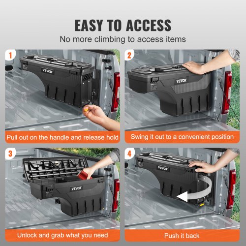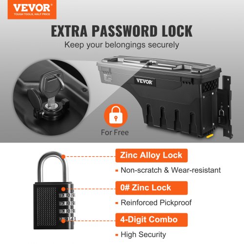 VEVOR Truck Bed Storage Box, Lockable Swing Case with Password Padlock, 6.6 Gal/25 L ABS Wheel Well Tool Box, Waterproof and Durable, Compatible with Ford F-150 2015-2021, Passenger SideGo Above and BeyondHermetically Sealed & Effective BarrierPerfect Storage SolutionInstall the BracketInstall the Storage BoxClasp onto Hinge PinsCompatible with: Ford F-150 2015-2021 R,Max Load: 75 lbs/34 kg,Max Capacity: 6.6 Gal/25 L,Color: Black (matte),Product Weight: 11 lbs/5 kg (Net); 19.8 lbs/9.0 kg (Gross),Main Material: ABS & Carbon Steel,Package Size: 36.4x11x16.7 in/925x280x425 mm
