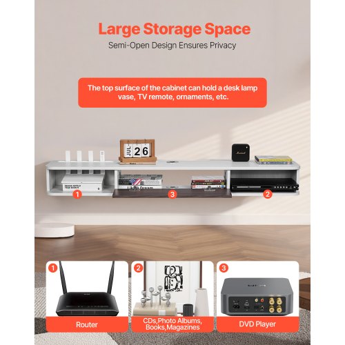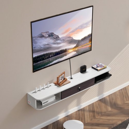 VEVOR Floating TV Stand, 55 in Wall Mount Entertainment Center with Cable Hole, Modern Floating TV Shelf with Storage Cabinet, Particle Board Console for DVD Player, Cable Box, Game Console, WhiteSmart Multi-Functional DesignEfficient StoragePrivacy ProtectionReinforced DesignEasy Installation & Quick SetupVersatile Modern StyleWeight Capacity: 115 lbs / 52 kg,Color: White, Wood Color,Item Model Number: SHSHDSG1116-2,Product Weight: 9.9 kg / 21.8 lbs (including all accessories),Material: E1 Particleboard,Cable Hole Diameter: 2.05 in / 52 mm,Product Dimensions: L x W x H: 55.12 in x 9.29 in x 6.29 in / 1400 mm x 236 mm x 160 mm