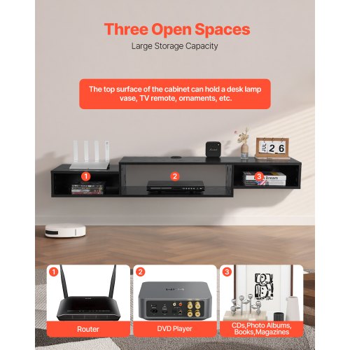 VEVOR Floating TV Stand, 59" Wall Mount Entertainment Center with Power Outlet & Cable Hole, Modern Floating TV Shelf with Storage Cabinet for DVD Player, Cable Box, Game Console, TV Accessory, BlackSmart Multi-Functional DesignEfficient StorageFlexible LayoutReinforced DesignEasy Installation & Quick SetupVersatile Modern StylePower Cord Length: 79 in / 2000 mm,Weight Capacity: 150 lbs / 68 kg,Color: Black,Item Model Number: SHSHDSG1117-1US,Product Weight: 13.1 kg / 28.9 lbs (including all accessories),Electrical Parameters: Input: AC 125V 60Hz 12A, Output: DC 5V 2.1A,Material: E1 Particleboard,Cable Hole Diameter: 2.05 in / 52 mm,Product Dimensions: L x W x H: 59.06 x 11.81 x 8.46 in / 1500 x 300 x 215 mm,Outlet Functions: 2 AC (Three-Prong) + 2 USB