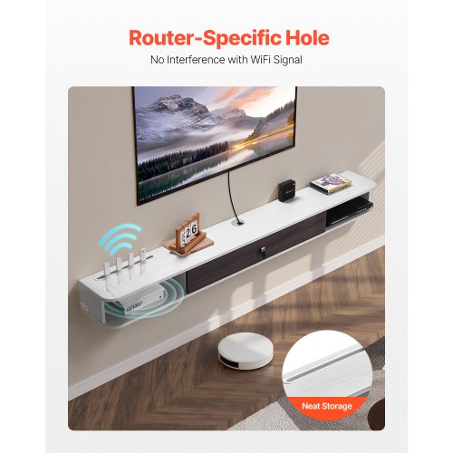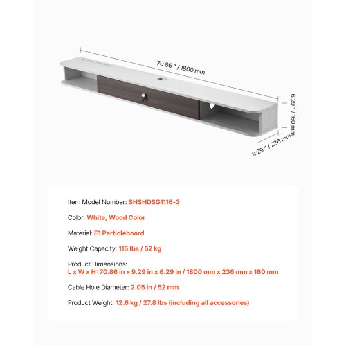 VEVOR Floating TV Stand, 70 in Wall Mount Entertainment Center with Cable Hole, Modern Floating TV Shelf with Storage Cabinet, Particle Board Console for DVD Player, Cable Box, Game Console, WhiteSmart Multi-Functional DesignEfficient StoragePrivacy ProtectionReinforced DesignEasy Installation & Quick SetupVersatile Modern StyleWeight Capacity: 115 lbs / 52 kg,Color: White, Wood Color,Item Model Number: SHSHDSG1116-3,Product Weight: 12.6 kg / 27.8 lbs (including all accessories),Material: E1 Particleboard,Cable Hole Diameter: 2.05 in / 52 mm,Product Dimensions: L x W x H: 70.86 in x 9.29 in x 6.29 in / 1800 mm x 236 mm x 160 mm