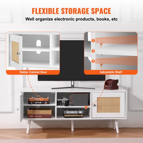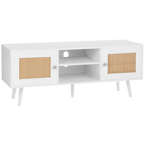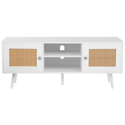 VEVOR Rattan TV Stand, Boho TV Cabinet for 55 inch TV, Mid Century Modern TV Stand, Rattan TV Console with Adjustable Shelfs for Living Room, Media Room, WhiteSpacious SurfaceAmple StorageConsiderate DesignFour Colors AvailableReliable QualityEffortless CleaningNumber of Layers: 3,Cabinet Internal Dimensions: 14.9×11.4×15.2in/379×290×387mm,Weight Capacity: 150 LBS,Cabinet Countertop Size: 47×16in,Color: White,Item Model Number: 10FJTRTVO10K,Support Leg Height: 6.3in/160mm,Product Weight: 48.4lbs/21.95kg,Applicable Maximum TV Size: 55in,Product Size: 47.2×15.8×19.3in/1200×400×490mm