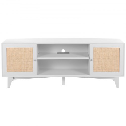 VEVOR Rattan TV Stand for 75in TV, Boho TV Stand with Rattan Door, Entertainment Center with Build-in Socket, Storage Cabinet with 2 Shelves, Modern TV Console for Living Room, Media Room, WhiteNatural WarmthSpacious SurfaceAmple StorageConsiderate DesignReliable Quality Made of thickEffortless CleaningNumber of Layers: 3,Cabinet Internal Dimensions: 17.4x17.4x13.8in/441×442×351mm,Power Strip Output: AC110~120V, 1500W,Color: White,Support Leg Height: 6.4in/162mm,Countertop Size: 65×15.7in,Product Size: 66x15.6x25in/1677×397×636 mm,Power Cord Length: 1.8 m/5.9 ft,Weight Capacity: 150 LBS,Number of Sockets: Three-prong Sockets x 3 + USB Ports x 2,Item Model Number: CSF-T24101-WHU,Product Weight: 74.7lbs/33.9kg,Applicable Maximum TV Size: 75in