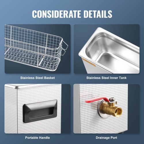 Brand: VEVORProfessional Ultrasonic Cleaning TechnologyAdvanced Transducer TechnologyHigh-Quality 304 Stainless SteelUser-Friendly Digital Control PanelWide ApplicabilityExceptional Structural DesignUltrasonic Transducers: 5 PCS,Product Dimensions: 530 x 165 x 296 mm,Noise Level: ≤75dB,Power Cord Length: 1.5 m,Capacity: 10L,Model: MH-042S,Control Time: 0-30 Minutes,Product Weight: 7.4 kg,Frequency: 40kHz,Temperature Range: 0-80°C,Ultrasonic Power: 300W,Heating Power: 300W,Stainless Steel Inner Tank Dimensions: 500 x 135 x 150 mm (Wall Thickness: 1.0 mm)