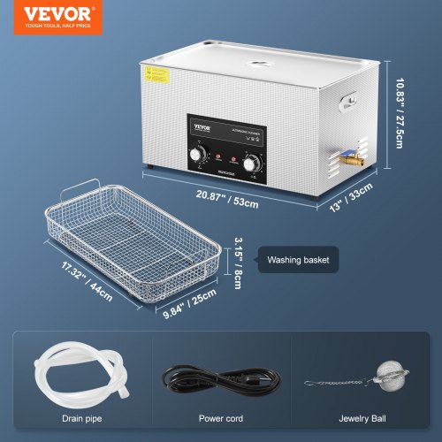 VEVOR 22L Ultrasonic Cleaner with Heater and Timer, 600W Stainless Steel Ultrasonic Cleaner Machine with Degas & Gentle Modes, Ultrasonic Parts Cleaner with Knob Control for Machine Part Auto ToolProfessional Ultrasonic Cleaning TechnologyAdvanced Transducer TechnologyHigh-Quality 304 Stainless SteelKnob OperationWide ApplicabilityOutstanding Structural DesignUltrasonic Transducers: 8 PCS,Product Dimensions: 530 x 330 x 275 mm,Noise Level: ≤75dB,Power Cord Length: 1.5 m,Capacity: 22L,Model: KZ-S22,Control Time: 0-30 Minutes,Product Weight: 10.35 kg,Frequency: 40kHz,Temperature Range: 0-110°C,Ultrasonic Power: 480W,Heating Power: 600W,Stainless Steel Inner Tank Dimensions: 500 x 300 x 150 mm (Wall Thickness: 1.0 mm)