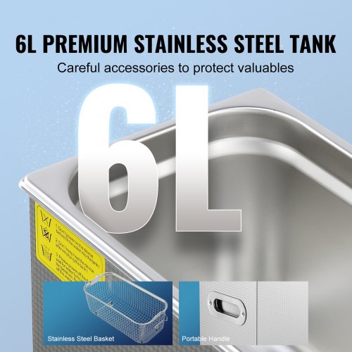 VEVOR Ultrasonic Cleaner with Digital Timer & Heater, Professional Ultra Sonic Jewelry Cleaner, Stainless Steel Heated Cleaning Machine for Glasses Watch Rings Small Parts Circuit Board (6L)Ultrasonic Cleaning TechnologyAdvanced Transducer TechnologyHigh-Quality 304 Stainless SteelConvenient Digital Control PanelWide ApplicationsConsiderate DesignTank Capacity: 6L,Time Setting: 0-30 min (LED Digital Display),Product Size (L x W x H): 12.8" x 6.9" x 10.8"/325x175x275 mm,Transducer Quantity: 3 pcs,Tank Size (L x W x H): 11.8" x 5.9" x 5.9"/300x150x150 mm,Product Weight: 10.1 lbs/4.6 kg,Frequency: 40kHz,Ultrasonic Power: 180W,Tank Material: Stainless Steel SUS304,Heating Power: 350W,Power Supply: AC 100-120V,60Hz,Temperature Setting: 0-80℃