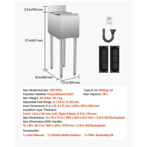 Commercial Ice Bin 28 L Underbar Ice Bin with Sliding Lid and Bottle HoldersCommercial Ice BinPremium Stainless Steel BuildRapid DrainageMulti-functional Bottle HoldersWidely ApplicableSecure & Sturdy PackagingInsulation Material: Polyurethane Foam,Insulation Layer Thickness: Front: 1.6 in / 40 mm; Left, Right & Back: 0.8 in / 20 mm,Type of Lid: Sliding Lid,Inner Dimensions: 9.8 x 15.4 x 11.3 in / 249 x 391 x 286 mm,Adjustable Feet Range: 0-1.18 in / 0-30 mm,Max Capacity: 28 L,Item Model Number: CIBT1912,Item Dimensions: 12 x 19 x 37 in / 305 x 483 x 937 mm + 3.9 in (H) Backsplash,Item Dimensions (With Handle): 12 x 19 x 38.2 in / 305 x 483 x 970 mm + 3.9 in (H) Backsplash,Insulation Duration: 24 Hours,Item Weight: 34.6 lbs / 15.7 kg