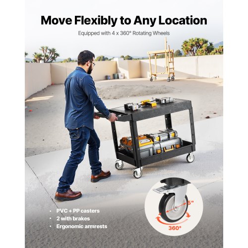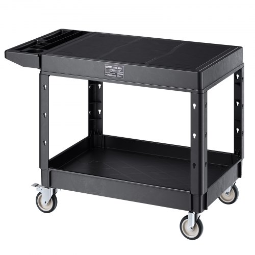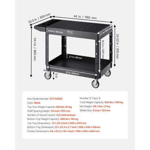 2-shelf Utility Cart 550 lbs 37 x 25.4-inch Service Cart with WheelsMobile WorkstationAmple Storage CapacitySmooth User ExperienceVersatile ApplicationsConvenient to UseEasy to CleanWheel Size: 5 in / 123 mm,Number of Swivel Casters: 4 (2 with brakes),Bottom Tray Dimensions: 37 x 25.4 x 2.7 in / 940 x 645 x 68 mm (inner depth),Top Tray Dimensions: 37 x 25.4 in / 940 x 645 mm,Number of Trays: 2,Color: Black,Bottom Tray Capacity: 400 lbs / 182 kg,Product Dimensions: 44 x 25.5 x 34.1 in / 1180 x 650 x 865 mm,Shelf Spacing Height: 24 in / 610 mm,Top Tray Capacity: 200 lbs / 91 kg,Total Weight Capacity: 550 lbs / 250 kg,Item Model Number: SYTCSS03,Net Weight: 46.3 lbs / 21 kg