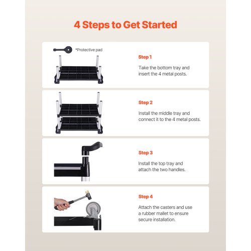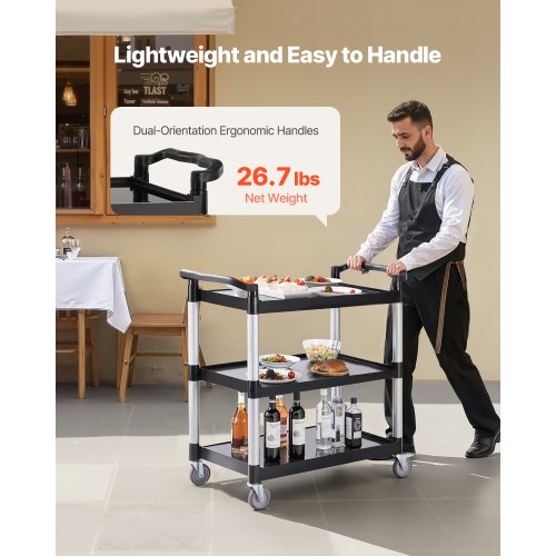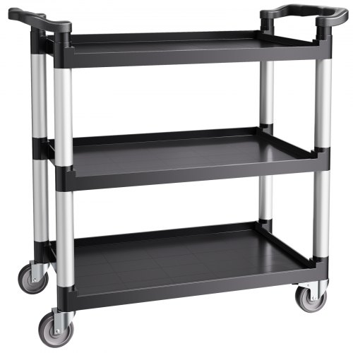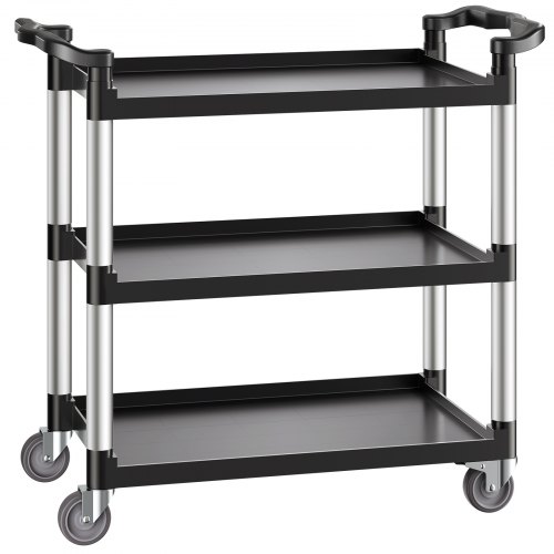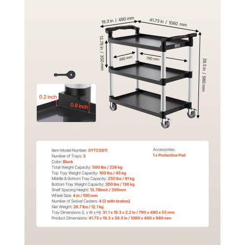Heavy Duty Utility Cart 500 lbs Capacity 3-tier Service Cart with WheelsYour Home HelperStable and StrongEasy to MoveVersatile UseSecurity FirstEasy to CleanWheel Size: 4 in / 100 mm,Number of Swivel Casters: 4 (2 with brakes),Top Tray Weight Capacity: 100 lbs / 45 kg,Tray Dimensions (L x W x H): 31.1 x 19.3 x 2.2 in / 790 x 490 x 55 mm,Number of Trays: 3,Color: Black,Bottom Tray Weight Capacity: 300 lbs / 136 kg,Middle Tray Weight Capacity: 250 lbs / 91 kg,Product Dimensions: 41.73 x 19.3 x 38.5 in / 1060 x 490 x 980 mm,Shelf Spacing Height: 13.8 in / 350 mm,Total Weight Capacity: 500 lbs / 226 kg,Item Model Number: SYTCSS11,Net Weight: 26.7 lbs / 12.1 kg