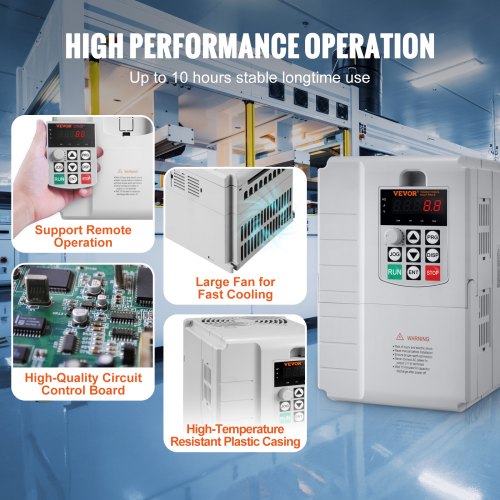 VEVOR VFD 7.5KW, 34A, 10HP Variable Frequency Drive for 3-Phase Motor Speed Control7.5KW, 10HP Variable Frequency DriveUser-Friendly OperationBuilt-in 10-Level Protection SystemEfficient Cooling with Low NoiseDetachable Panel DesignVersatile ApplicationsInput Frequency: 50/60Hz,Operating Temperature: 50°F-104°F / 10°C-40°C,Horsepower: 10HP,Item Model Number: AT1-7500X,Input Voltage: AC 220-240V Single Phase,Current: 34A,Output Voltage: AC 220-240V Three Phase,Net Weight: 7.7 lbs / 3.5 kg ± 3%,Power: 7.5KW,Output Frequency: 0-400Hz