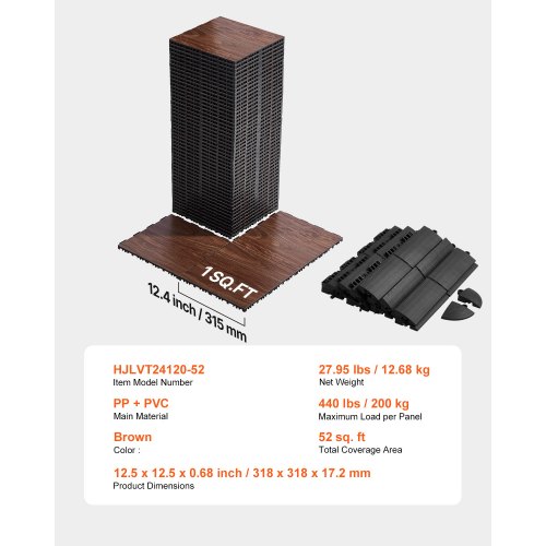 VEVOR Dryland Tiles for Gym Floor Mat, 12.4 x 12.4 in Interlocking Dance Enthusiasts Training Mat, 52 PCS Interlocking PP+PVC Puzzle Floor Tiles, BrownImmersive TrainingVersatile UseMulti-FunctionalityQuick Setup & Easy StorageThree Coverage OptionsSafe & ReliableTotal Coverage Area: 52 sq. ft,Color: Brown,Item Model Number: HJLVT24120-52,Maximum Load per Panel: 440 lbs / 200 kg,Quantity: 52 pcs,Product Dimensions: 12.4 x 12.4 x 0.68 inch / 315 x 315 x 17.2 mm,Net Weight: 58.11 lbs / 26.36 kg,Main Material: PP + PVC