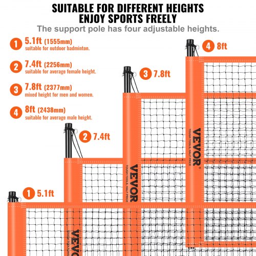 VEVOR Volleyball and Badminton Set, Outdoor Portable Badminton Net, Adjustable Height Steel Poles, Professional Combo Set with PVC Volleyball, Pump, Carrying Bag, Easy Setup for Backyard Beach LawnDurable NettingStable SupportAdjustable HeightLight and Easy to CarryVersatile UseEasy to AssembleNet Edging Size: Sides 4"/ Top and Bottom 1.5",Product Unfolded Size: 32x0.1x8 ft / 9700x32x2450 mm,Net Material: 21 Strands of PE Line,Item Model Number: JH-301,Mesh Edge Length: 1.25"/ 31.75 mm,Support Pole Material: Q195 Steel Material,Support Pole Diameter: 1.26" / 32 mm,Net Weight: 14.55 pounds / 6.6 kg (including all accessories),Net Edging Material: 0.35mm Thick Cladding Cloth