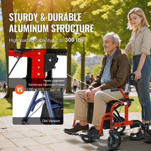 VEVOR 2 in 1 Rollator Walker & Transport Chair for Seniors, Folding Rolling Walker Wheelchair Combo & Footrests, Lightweight Aluminum Mobility Walker with Adjustable Handle, All Terrain Wheels, 300LBSAdjustable Handle HeightEnhanced MobilitySecure & User-Friendly Braking SystemQuick Folding For Space SavingSpacious and Comfortable SeatingEnjoy A Healthier WayStorage Bag Size: 15.6 x 12.4 x 3.9 in / 395 x 315 x 100 mm,Weight Capacity: 300 lbs / 136 kg,Front Wheel Size: 8 inch,Rear Wheel Size: 10 inch,Inner Width of Armrests: 18.1 in / 460 mm,Color: Red,Item Model Number: FBL427113,Seat Height: 21.7 in / 550 mm,Product Dimensions: 39.4 x 24.2 x 33.3 in / 1000 x 615 x 845 mm,Net Weight: 19.7 lbs / 8.95 kg