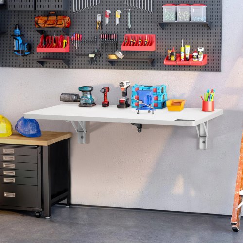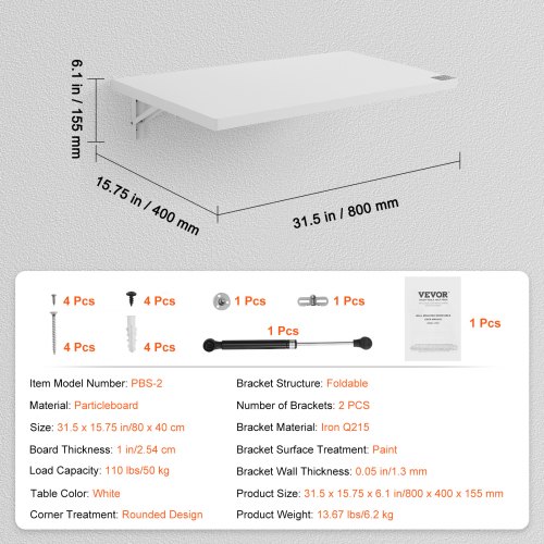 VEVOR Wall Mounted Folding Table, 31.5" x 15.75" Wall Mount Drop Leaf Table, Floating Desk with Iron Bracket, Fold Down Desk for Small Spaces, Home Office, Dining, Laundry Room, Kitchen, Bar, WhiteStylish and PracticalSpacious TabletopPremium and SafeSimple InstallationVersatile UseSafe Rounded CornersProduct Size (Unfolded): 31.50 x 15.75 x 6.10 in/800 x 400 x 155 mm,Bracket Surface Treatment: Paint,Load Capacity: 110 lbs/50 kg,Size: 31.50 x 15.75 in/800 x 400 mm,Item Model Number: PBS-2,Product Weight: 13.67 lbs/6.2 kg,Material: Particleboard,Bracket Material: Iron Q215,Board Thickness: 1 in/25.4 mm