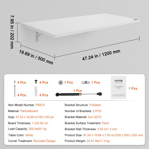 VEVOR Wall Mounted Folding Table, 47.24" x 19.69" Wall Mount Drop Leaf Table, Floating Desk with Iron Bracket, Fold Down Desk for Small Spaces, Home Office, Dining, Laundry Room, Kitchen, Bar, WhiteStylish and PracticalSpacious TabletopPremium and SafeSimple InstallationVersatile UseSafe Rounded CornersProduct Size (Unfolded): 47.24 x 19.69 x 7.95 in/1200 x 500 x 202 mm,Bracket Surface Treatment: Paint,Load Capacity: 200 lbs/91 kg,Size: 47.24 x 19.69 in/1200 x 500 mm,Item Model Number: PBS-6,Product Weight: 24.91 lbs/11.3 kg,Material: Particleboard,Bracket Material: Iron Q215,Board Thickness: 1 in/25.4 mm