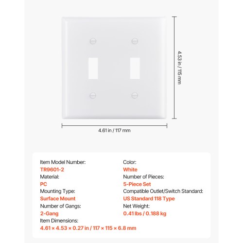 2-Gang Toggle Light Switch Outlet Covers Wall Plates 4.61 x 4.53in White 5 PackConvenient Dual ControlWide CompatibilityEnhanced SecurityDurability ConstructionDesign VersatilityEasy to InstallNumber of Gangs: 2-Gang,Compatible Outlet/Switch Standard: US Standard 118 Type,Number of Pieces: 5-Piece Set,Color: White,Item Model Number: TR9601-2,Material: PC,Item Dimensions: 4.61 x 4.53 x 0.27 inch / 117 x 115 x 6.8 mm,Mounting Type: Surface Mount,Net Weight: 0.34 lbs / 0.156 kg