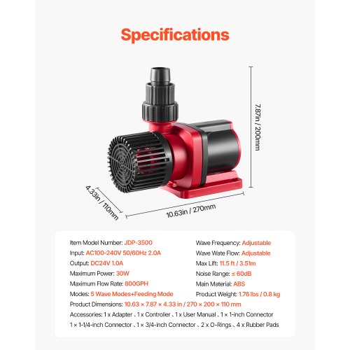 Aquarium 24V DC Water Pump with Controller 30W 800 GPH Wave Maker Return PumpCreate Natural Ocean CurrentsQuiet DesignMultiple Placement OptionsEasy to Disassemble and CleanWidely ApplicableAdjustable Water FlowMax Power: 30W,Wave Frequency: Adjustable,Max Lift: 11.5 ft / 3.51m,Wave Modes: 5 Modes,Max Flow Rate: 800GPH,Product Dimensions: 10.63 x 7.87 x 4.33 in / 270 x 200 x 110 mm,Input: AC100-240V, 50/60Hz, 1.0A,Output: DC24V 1.0A,Noise Range: ≤ 60dB,Item Model Number: JDP-3500,Wave Wate Flow: Adjustable,Product Weight: 1.76 lbs / 0.8 kg,Main Material: ABS