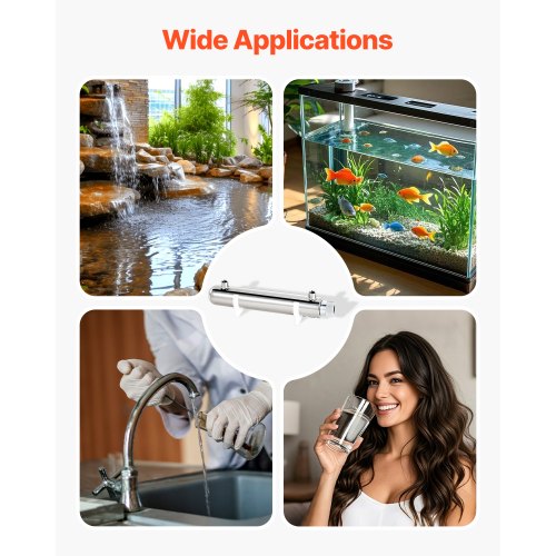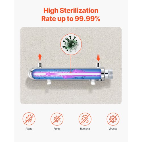 110V 12W UV Water Purifier 1GPM Ultraviolet Water Purifier FilterEfficient SterilizationReliable QualityLong-Lasting DurabilityEasy InstallationVersatile ApplicationHigh-Quality UV LampLamp Power: 12W ±10%,Maximum Water Treatment Capacity: 1 GPM (3.785 L/min),Total Power: 16W ±10%,Item Model Number: SSE-012,Net weight: 1.85 lbs/0.84 kg (including all accessories),Max Inlet Pressure: 0.8MPa,Product Dimensions: 12.4 x 2.01 x 3.15 in/315 x 51 x 80 mm,Wavelength: 253.7nm,Sterilization Rate: Over 99.99% (under maximum flow rate),Main Material: Housing: 304 Stainless Steel; UV Lamp: Quartz,Lamp Lifespan: 8000 hours,Inlet/Outlet Interface Specification: 1/4" NPT Internal Thread