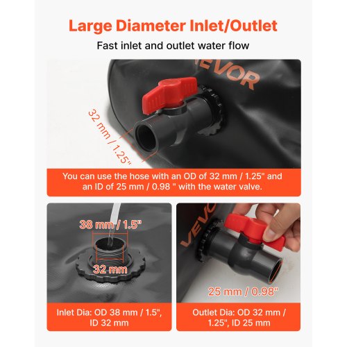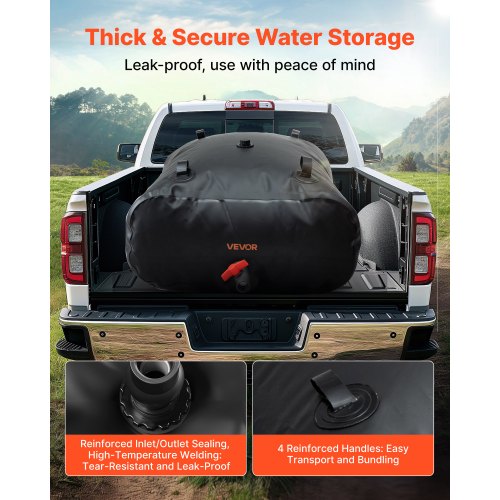 VEVOR Water Storage Bladder 87 Gal PVC Collapsible Portable Water Tank Black<br/>87.17-Gal Capacity for Daily Use<br/>Durable to Use<br/>Efficient Leak Prevention<br/>High Compatibility<br/>Wide Application<br/>Collapsible Design<br/>Thickness: 1.2 mm/0.047",Full Water Size(L x W x H): 46.5 x 30.7 x 15 in / 1180 x 780 x 380 mm,Max Capacity: 87.17 Gal/330 L,Item Model Number: WT-20330,Temperature Range: -30°C to 70°C,Material: PVC,Density: 1000D,Weight: 13 lbs / 5.9 kg