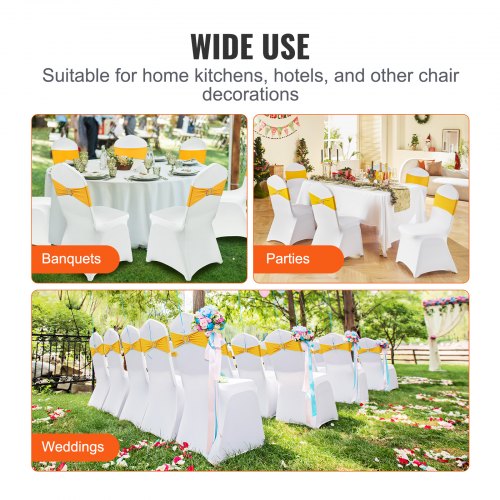 VEVOR Stretch Spandex Folding Chair Covers, Universal Fitted Chair Cover with Chair Sashes, Removable Washable Protective Slipcovers, for Wedding, Holiday, Banquet, Party, Dining (50 Set Gold & White)Premium MaterialSuperior PerformanceMulti-Chair CompatibilityEasy to Use and CleanWidely ApplicableGood Elastic FabricColor: White & Gold,Item Model Number: RD-VV-27,Product Weight: 17.5 lbs / 7.95 kg,Decorative Strap Fits Chair Back Width: 19.7 inch / 500 mm (Max),Fits Chair Dimensions: 22x17.7x36.8 inch / 560x450x935 mm (Max)