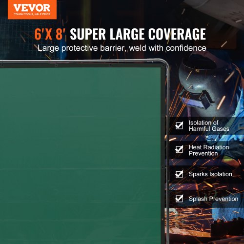 VEVOR Welding Screen with Frame, 6' x 8' Welding Curtain Screen, Flame-Resistant Vinyl Welding Protection Screen on 4 Swivel Wheels (2 Lockable), Moveable & Professional for Workshop/Industrial, GreenPremium Flame-Resistant MaterialEasy MovementStable StructureSuperior UV ProtectionWide ApplicationsEasy Cleaning and MaintenanceProtection Level: 6- Level UV Protection,Number of Segments: 8,Color: Green,Item Model Number: XU-2313,Product Dimensions: 6 x 8 ft,Net Weight: 17.5 lbs / 7.91 kg,Main Material: Flame-Retardant Vinyl