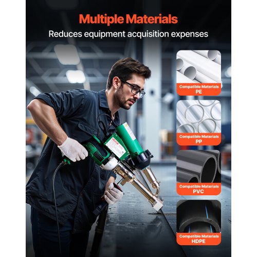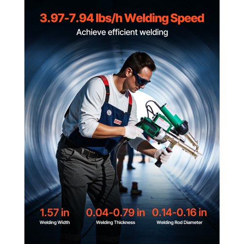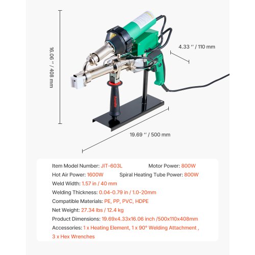 Handheld Plastic Welding Extruder 800W Hitachi Motor Extrusion Welding GunEfficient WeldingPrecise Temperature ControlEfficient Welding800W Hitachi MotorPortable ToolboxExtended Power CordCompatible Materials: PE, PP, PVC, HDPE,Spiral Heating Tube Power: 800W,Welding Thickness: 0.04-0.79 in / 1.0-20mm,Hot Air Power: 1600W,Weld Width: 0.79 in / 20 mm,Item Model Number: JIT-603L,Motor Power: 800W,Product Dimensions: 23.43 x 19.29 x 6.5 in / 595 x 490 x 165 mm,Net Weight: 27.34 lbs / 12.4 kg