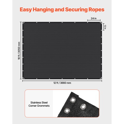 VEVOR 90% Sun Shade Cloth, 10 x 12 ft Pergola Shade Cover with Stainless Steel Grommets, Sun Shades Canopy Privacy Screen with 140 GSM HDPE Material, for Outdoor, Patio, Garden, and Backyard (Black)Sunshade FabricTear & Abrasion-ProofDual FunctionEasy InstallationVersatile UseStylish DesignArea: 120 sq. ft / 11.163 m²,Shape: Rectangular,Color: Black mesh fabric with black edging,Item Model Number: SSZGB-06,Product Weight: 4.3 lbs / 1.95 kg,Weight: 140 GSM,Main Material: HDPE,Product Size: 10 x 12 ft / 3050 x 3660 mm