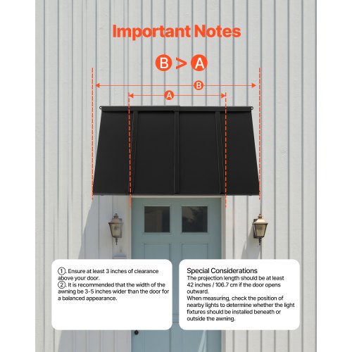 Window Awning Door Canopy 44x24 in Outdoor Steel Front Door Awnings Anti-RustComprehensive ProtectionStable and Sturdy StructureNo More Water AccumulationFamily-Friendly DIYStylish and VersatileWind-Resistant StrengthSunshade Area: 44 × 24 inches (1125 × 610 mm),Item Model Number: CGW-44INCH,Product Weight: 10.2 kg,Product Dimensions: 1125 × 590 × 610 mm,Compatible Door Width: 31.50 inches / 800 mm,Main Material: Steel