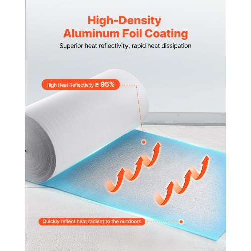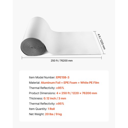 VEVOR Reflective Insulation Roll EPE Foam Core Radiant Barrier 3mm 48in x 250ft<br/>Superior Thermal Insulation<br/>Premium Material<br/>Easy Installation Tips<br/>Multiple Size Options<br/>Versatile Application<br/>Free to Cut<br/>Thickness: 0.12 inch / 3 mm,Thermal Reflectivity: ≥95%,Item Quantity: 1 Roll,Item Model Number: EPE15B-3,Material: Aluminum Foil + EPE Foam + White PE Film,Product Dimensions: 4 x 250 ft / 1220 x 76200 mm,Net Weight: 20 lbs / 9 kg