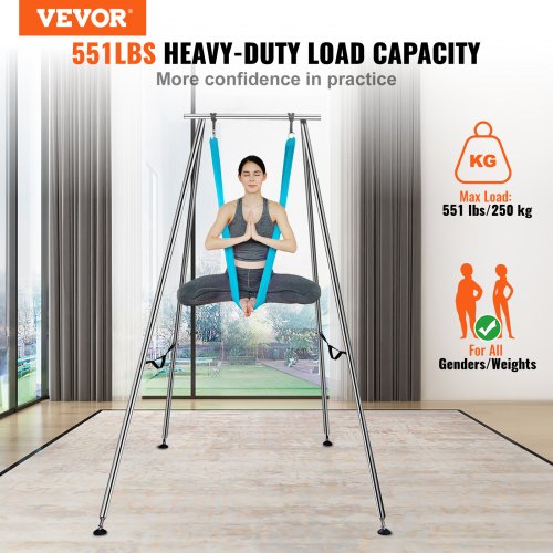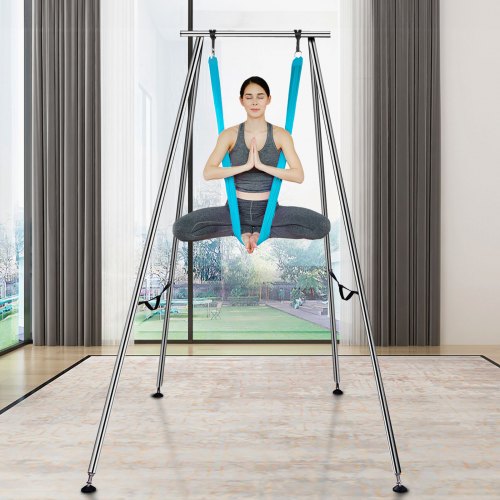 VEVOR Aerial Yoga Frame & Yoga Hammock, 9.67 ft Height Professional Yoga Swing Stand Comes with 13.1 Yards Aerial Hammock, Max 551.15 lbs Load Capacity Yoga Rig for Indoor Outdoor Aerial Yoga, BlueReinforced Steel TubingUpgraded Chrome PlatingAerial Yoga HammockTriangular StructureEasy-Peasy Setup551.15 lbs Weight CapacityHammock Material: Polyester,Hammock Size: 13.12 x 3 yards/12 x 2.6 m,Stand Material: Q195 Chrome-Plated,Color: Blue,Item Model Number: HM-559B12,Product Weight: 69.44 lbs/31.5 kg,Max Load Capacity: 551.15 lbs/250 kg,Stand Size: 8.30 x 6.3 x 9.68 ft/2530 x 1920 x 2950 mm
