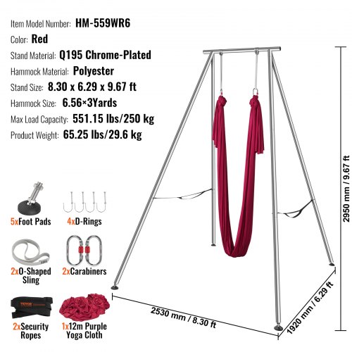VEVOR Aerial Yoga Frame & Yoga Hammock, 9.67 ft Height Professional Yoga Swing Stand Comes with 6.6 Yards Aerial Hammock, Max 551.15 lbs Load Capacity, Yoga Rig for Indoor Outdoor Aerial Yoga, RedReinforced Steel TubingUpgraded Chrome PlatingAerial Yoga HammockTriangular StructureEasy-Peasy Setup551.15 lbs Weight CapacityHammock Material: Polyester,Hammock Size: 6.56 x 3 yards/6 x 2.6 m,Stand Material: Q195 Chrome-Plated,Color: Red,Item Model Number: HM-559WR6,Product Weight: 65.25 lbs/29.6 kg,Max Load Capacity: 551.15 lbs/250 kg,Stand Size: 8.30 x 6.3 x 9.68 ft/2530 x 1920 x 2950 mm