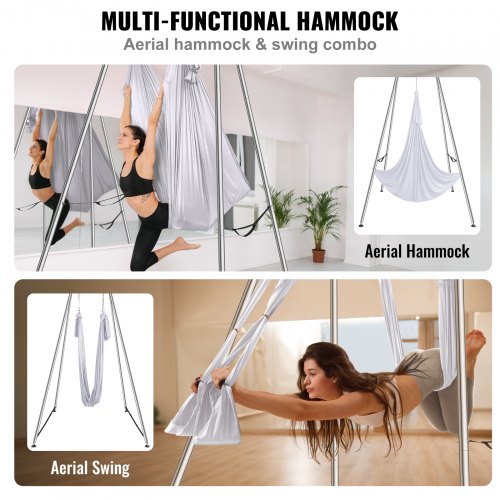 VEVOR Aerial Yoga Frame & Yoga Hammock, 9.67 ft Height Professional Yoga Swing Stand Comes with 6.6 Yards Aerial Hammock, Max 551.15 lbs Load Capacity Yoga Rig for Indoor Outdoor Aerial Yoga, WhiteReinforced Steel TubingUpgraded Chrome PlatingAerial Yoga HammockTriangular StructureEasy-Peasy Setup551.15 lbs Weight CapacityHammock Material: Polyester,Hammock Size: 6.56 x 3 yards/6 x 2.6 m,Stand Material: Q195 Chrome-Plated,Color: White,Item Model Number: HM-559W6,Product Weight: 65.25 lbs/29.6 kg,Max Load Capacity: 551.15 lbs/250 kg,Stand Size: 8.30 x 6.3 x 9.68 ft/2530 x 1920 x 2950 mm